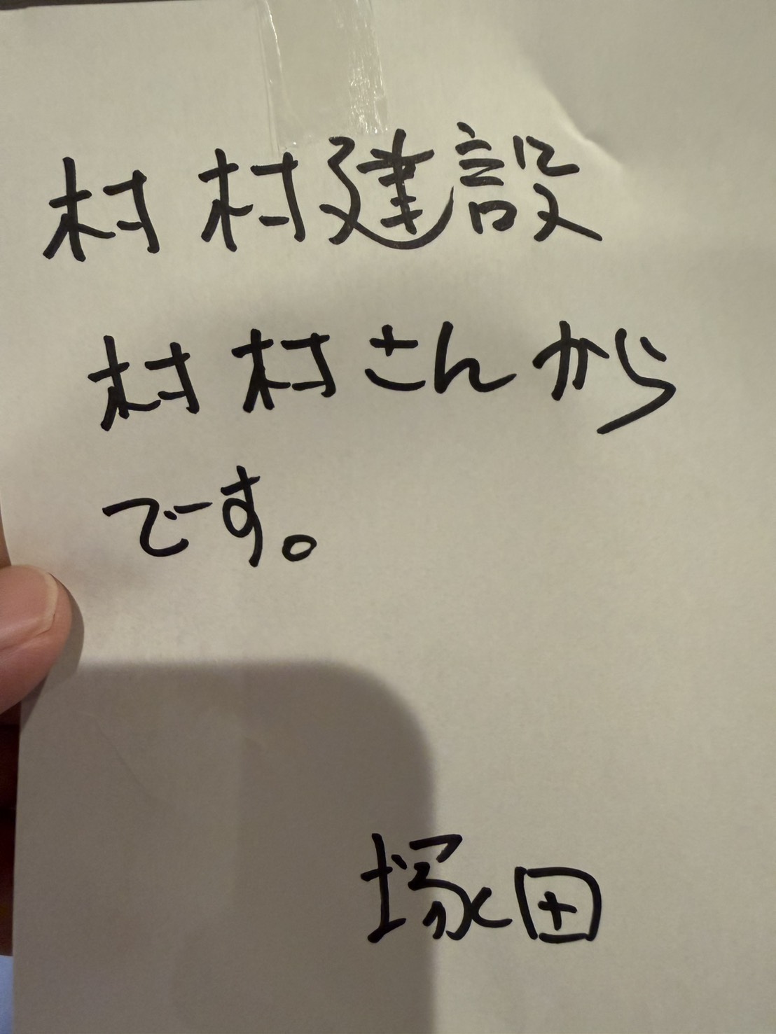 で、写真をよく見ると、そこには「村村建設 村村さんからです」と・・・。