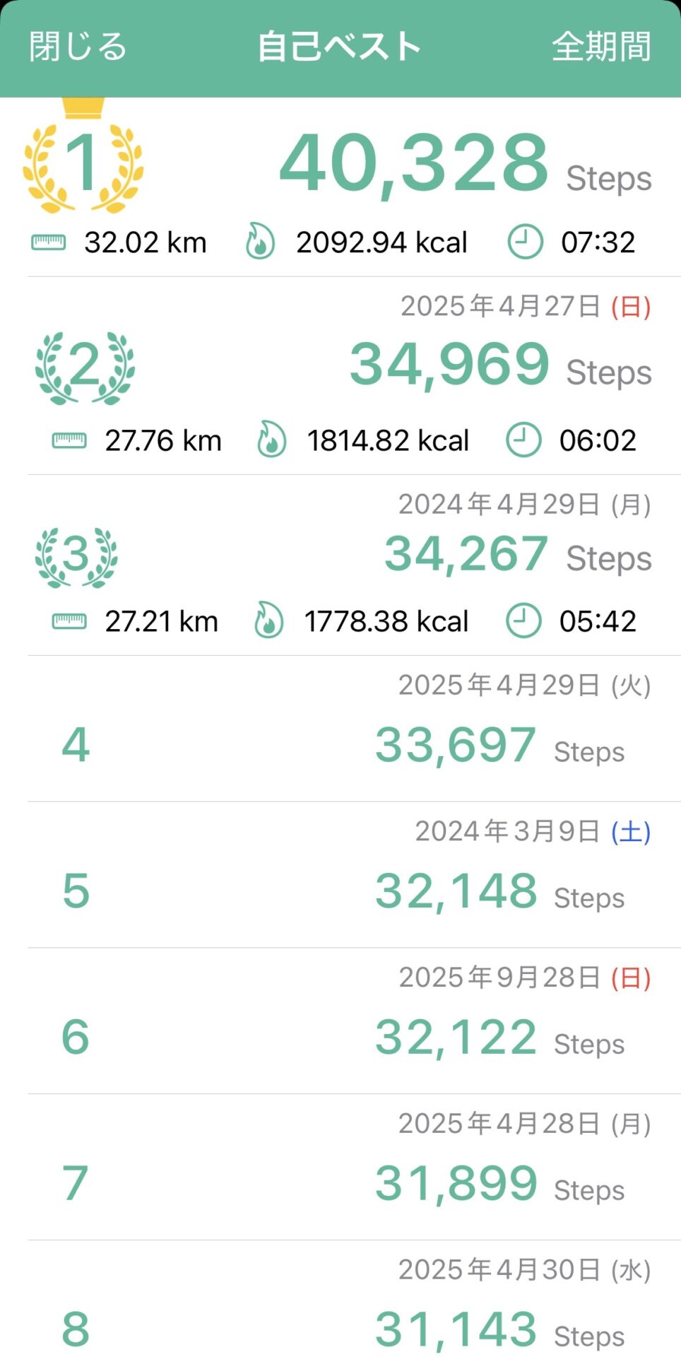 ここ7年近く、ほぼ欠かさず毎日の歩数を記録しているのですが、その歴代ベスト10(写真は8までですが)の中に、なんと4月27日から4月30日までの4日間で、5日分もランクインしていたのです。